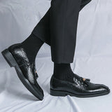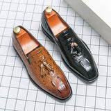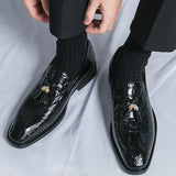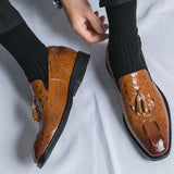An exotic crocodile embossed finish brings a premium texture to these high-gloss leather loafers, complete with classic tassel accents and a comfortable insole.