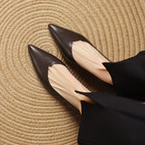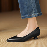 A pointed toe sharpens the elegant profile of these genuine leather slip-ons, supported by a sculpted low heel and a comfortable insole, blending modern elegance with everyday versatility.