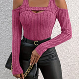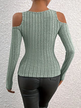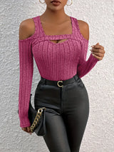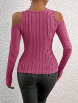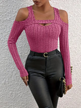 Add a hint of bold femininity to your wardrobe with this ribbed cold-shoulder knit top. Featuring a sculpted fit with a subtle chest cutout and soft velour texture, it strikes a balance between flirtation and elegance. The unique neckline adds a modern architectural twist, making it easy to elevate your look with high-rise trousers or leather bottoms.