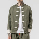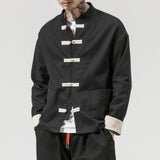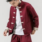 Inspired by traditional Japanese tailoring, this jacket features a stand collar and distinctive knotted toggle closures for a refined, heritage look. Crafted from breathable cotton with a relaxed fit and contrast cuff lining, it merges cultural tradition with modern casual wear.