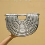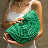 Sonata Crescent - A sculptural crescent bag with layered ripple detailing and a polished top handle. Smooth, genuine leather finish with a detachable crossbody strap, statement-worthy yet roomy for phone, wallet, keys, lipstick, and more.