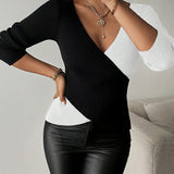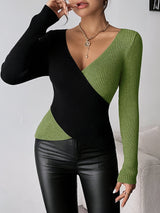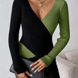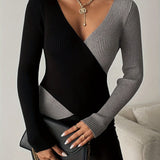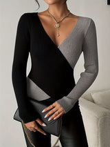 Sharp contrast, fluid lines — The deep charcoal and jet-black panels cut across the body in a precise wrap, tracing the waist and elongating the frame. It's fine rib texture catches light in quiet waves, while the close fit and plunging neckline bring a subtle, confident edge.
