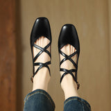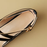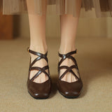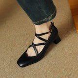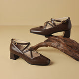 Sleek cross-straps and a polished buckle closure bring flattering charm to these premium leather pumps, featuring a modern almond-toe and a comfortable block heel for versatile styling.