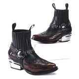A fearless fusion of Western attitude and rockstar edge, these ankle boots command attention with every step. Crafted from polished leather, the flame-cut overlays blaze across the vamp, while the studded harness strap and skull emblem buckle bring a rebellious punch. The metallic stacked heel sets them apart with unmistakable character, built for those who thrive on standing out.
