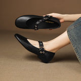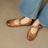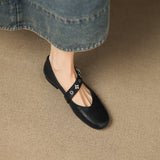 Burnished genuine leather shapes these round-toe flats, accented with a unique buckle strap and cushioned insole for a comfortable, easy-to-style look.