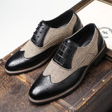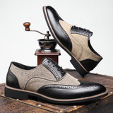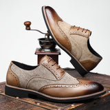 A vintage-inspired dress shoe that blends smooth leather with a herringbone fabric panel. The pointed toe and brogue detailing deliver classic polish, while the cushioned fabric-lined interior and grippy rubber sole keep every step comfortable for office days, events, and nights out.